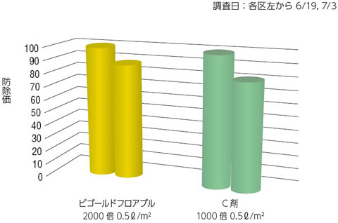 無処理区に対して高い効果を示し、対照剤と同等の効果が認められた。 薬害は認められなかった