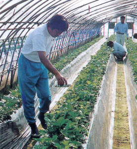 千葉県内ではイチゴの直売・イチゴ狩りが年々増加する傾向にある。成東町観光苺組合はその対応が早く、安定した観光イチゴの産地となっている。今まで味で勝負の観光園としてその地位を築いてきたが、今後もさらなる発展を継続していくためには、別のカラー(安全性)も必要である。導入にあたって会員と話し合った時、お客さんから安全性の要望が非常に強いという話が多く出された。園主としても、そのまま口に運ばれる果実のため収穫期間中は農薬散布を行ないたくないとの話であった。イチゴの場合、収穫期間中は最低限の農薬散布で対応するが、長期間収穫するためは、やむを得ず農薬を散布しなければならない場合も想定される。天敵で長期間、害虫をコントロールできれば非常に良い技術である。また天敵の放飼はボトルから直接拡散させるだけなので、忙しい収穫期間中での省力にもつながる。自信を持って生産物を販売できるひとつの方法として天敵利用による防除確立に期待が寄せられた。