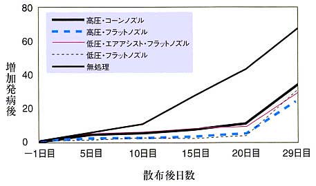 1回の散布後定期的に発病の推移を調査した結果、散布装置別には、マンゼブ水和剤の50l/10a散布で低圧エアアシスト散布区が他の散布装置と比較してやや効果が劣る傾向が見られた(第4図)。DMI系乳剤では同一散布量の散布装置間で効果差は少なく、25l/10aでは効果がやや劣る傾向も見られた。いずれの処理区も薬害は認められなかった(第5図、第6図)。