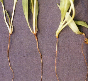 そう根病は近年増加の傾向は見られないが、潜在的にウイルスに汚染されている圃場が多いので、最近登場してきた「きたさやか」、「モリーノ」等収量を改善したタイプの抵抗性品種を活用すべきで、特に、そう根病が圃場のごく一部に発生する場合は、生産性の劣る従来の抵抗性品種に比べ減収しないので作付が奨められる。しかし、これら新しいタイプの抵抗性品種は糖分が低いので更に性能改善を期待したい。