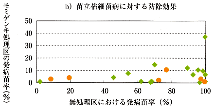 平成9~11年度生物農薬連絡試験成績および平成13年度特別連絡試験成績((社)日本植物防疫協会)を概観すると、両病害に対する防除効果は安定しており、浸種後の催芽時における24時間浸漬処理を無処理区の発病程度別にグラフにプロットしてみると、両病害とも無処理区の発病苗率60%程度までは防除効果に差はみられない。これを越える条件では両病害ともに防除効果に振れがみられるようになる。この現象は200倍液、500倍液いずれの処理においても同じ傾向にある(第1図)。
