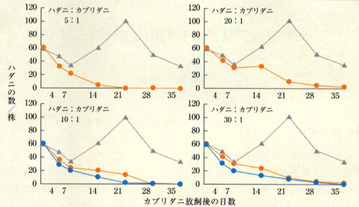 ▲第1図 イチゴのカンザワハダニに対するミヤコカブリダニとチリカブリダニの