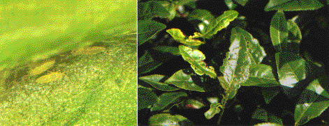 チャノミドリヒメヨコバイは、若葉の葉裏に生息して吸汁加害する。新芽の初期に加害されると、被害の軽いものは新葉がしおれて葉脈が褐変する程度であるが、被害がひどくなると葉緑が褐変し、新葉は萎縮、硬化し、被害が進むと落葉するため減収、品質低下をまねく、6月から9月に発生し、三番茶および秋芽に被害が多くみられるため、この時期に重点を置いて防除する。防除は、三番茶では茶芽の1~2葉期に行なうが、秋芽は、芽の伸張する期間が長いので2~3回の防除が必要である。