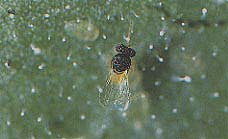 | オンシツコナジラミ幼虫に産卵管を挿入しているオンシツツヤコバチ |