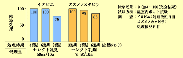 - セレクト乳剤は広範なイネ科雑草に有効であり、スズメノカタビラ、イヌビエ、メヒシバ、オヒシバといった1年生雑草のみならず、シバムギ、コヌカグサ(別名レッドトップ)などの多年生雑草にも有効である。大多数のイネ科雑草に対しては10a当り施用量50mlで十分な効果を示すが、スズメノカタビラや多年生雑草に対しては75mlの施用が必要である。(第2表)。