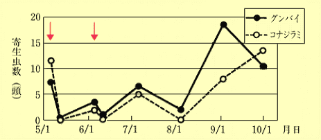 オルトラン水和剤は、散布4週間後においてもツツジグンバイおよびツツジコナジラミとも散布前の密度以下に抑えた。MEP乳剤はツツジグンバイに対してはオルトラン水和剤とほぼ同様の効果を期待できるが、ツツジコナジラミに対しては効果が劣った。このため、MEP乳剤を散布するとツツジコナジラミが優占種となることがある。 ツツジグンバイとツツジコナジラミが少数発生している垣根仕立てのツツジにおいて、オルトラン水和剤(1,000倍)およびMEP乳剤(1,000倍)を5月と6月に散布した結果は第2図、第3図である。 ![]()