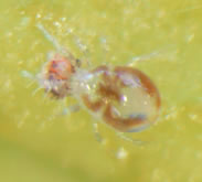 写真4. ミカンハダニを捕食して赤く変色したスワルスキーカブリダニ